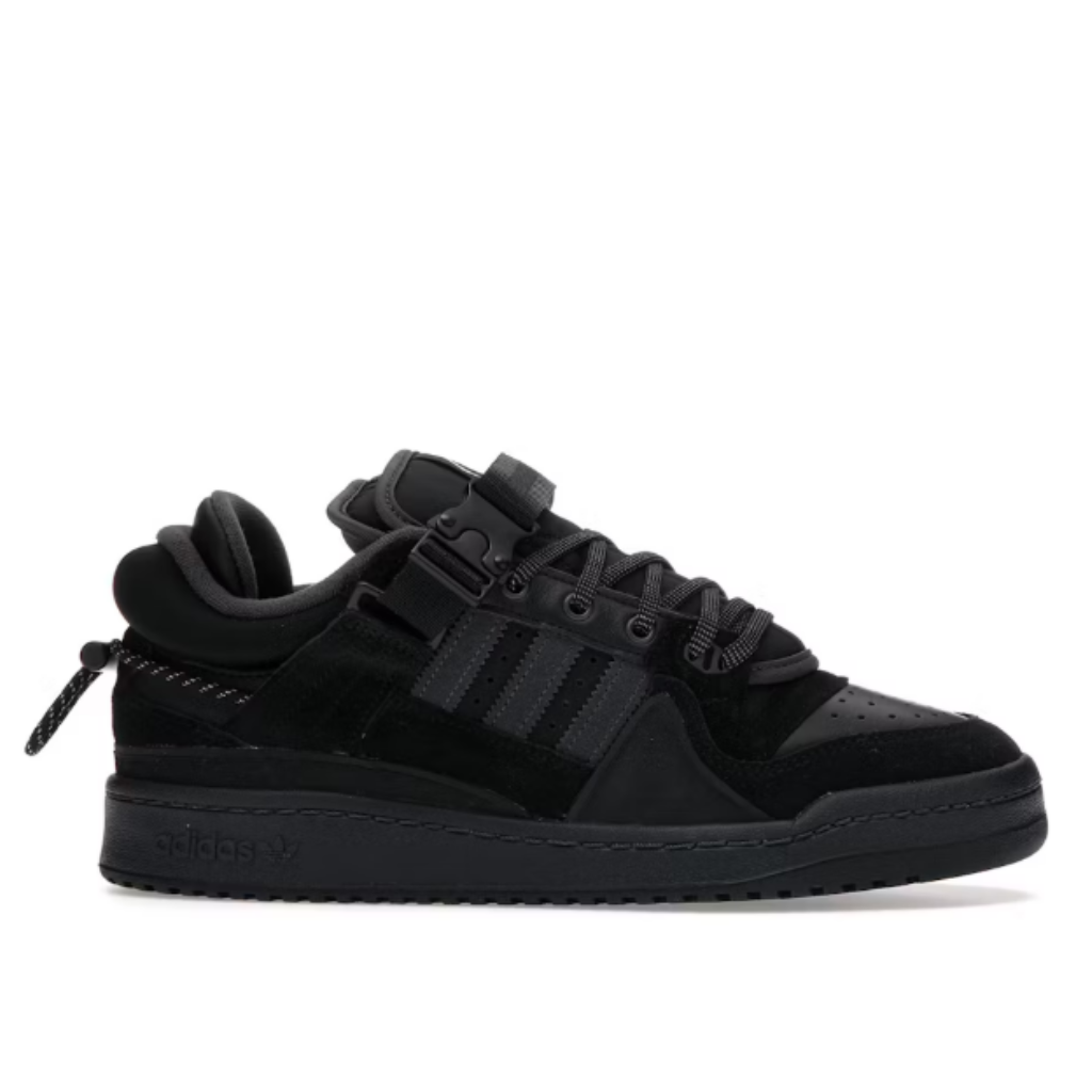 Los sneakers adidas Forum Low Bad Bunny Back To School incluyen un diseño de triple piel negra y un upper de ante encima de una suela negra. Al igual que los modelos Bad Bunny Forum anteriores, este modelo Forum está equipado con una lengüeta doble y una correa para el tobillo acolchada.Los adidas Forum Low Bad Bunny Back To School se lanzaron en agosto de 2021 a un precio retail de $160 USD.